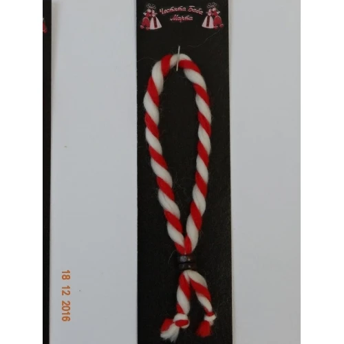 мартеничка за ръка от 100 % вълнен шнур със стопер - дървен цилиндър
