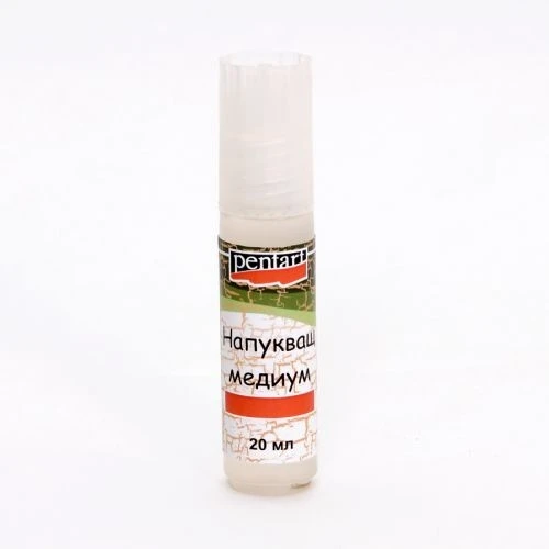 Еднокомпонентният Pentart напукващ медиум придава усещане за античност на всяка повърхност, напомняйки за стара напукана боя. Начин на приложение: Нанесете върху повърхността, която ще декорирате един цвят акрилна боя. След изсъхване нанасете напукващия медиум. В зависимост от пукнатините, които желаете да получите, нанасянето може да става с четка - за хоризонтални или вертикални пукнатини, или с финопореста гъба - за неподредени пукнатини. Обърнете внимание, че когато нанасяте с четка, движенията трябва да са винаги само в една посока - от ляво на дясно или от горе на долу. Видът на пукнатините зависи и дебелината на нанесения слой медиум - колкото е по-дебел, толкова по-изразени ще са те. След изсъхване на медиума, нанесете върху него втори слой акрилна боя, различна по цвят, контрастна на първата. По време на съхнене, вторият слой боя се напуква и в пукнатините се вижда първият слой боя, т.е. напукващият медиум, който е абсолютно прозрачен остава в "сандвич" между двата цвята акрилна боя, напуквайки този над него.Обявената цена е за разфасовка от 20 мл.
