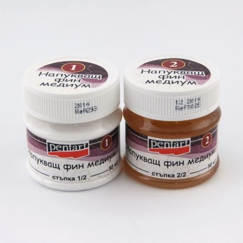Двустепенният Pentart Фин напукващ медиум имитира напукан горен слой /лаковото покритие/ на стари предмети. За разлика от едностепенният напукващ медиум, който напуква положения върху него слой акрилна боя, двустепенният се самонапуква. Тъй като след изсъхване той става водоустойчив, може да се използва и като ефектен напукан краен лак върху декорираната повърхност.За подсилване на ефекта от пукнатините, можете да втриете в тях някаква паста - материал, който не е на водна основа.Видът на пукнатините, зависи от посоката на нанасяне на компонентите и дебелината на слоя им.Обявената цена е за комплект от 2 разфасовки от по 50 мл всяка.