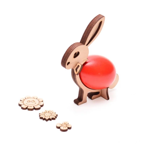Великденско зайче - поставка за яйце. Поставката е изработена от лазерно рязани дървени елементи.За по-добър завършек на декорацията в комплекта са включени 3 елемента - цветя. Фигурките могат да се оцветяват. Поставката се предлага в разглобено състояние. Размери на поставката: 12х9х4 см.