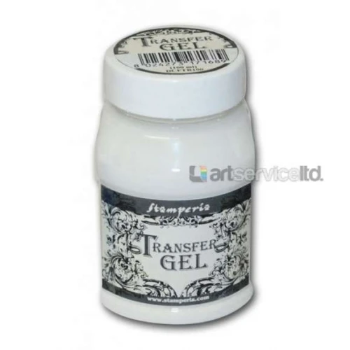 Трансферният гел на Stamperia е предназначен за пренасяне на плътни и негъвкави изображения в подходящ вид за работа с декупажна техника.Трансферният медиум на "Стамперия" е на водна основа. Нанася се на няколко слоя върху желаното изображение. Всеки един от слоевете на медиума трябва да е напълно изсъхнал преди полагането на следващия, като съхненето на един пласт от лака отнема около 30-40 минути. След изсъхването на последния трансферен пласт опаковата страна на картинката се навлажнява с мокра четка и с изтърква с пръст, за да се отстрани хартията. Мокренето с вода и търкането се повтарят докато цялата хартиена основа на изображението не се изтрие, оставяйки само щрихите на отпечатаната върху прозрачния трансферен лак картина. Така подготвената картина може да се използва като декупажна хартия и да се залепи с декупажно лепило към различни повърхности.Обявената цена е за разфасовка от 100 мл.