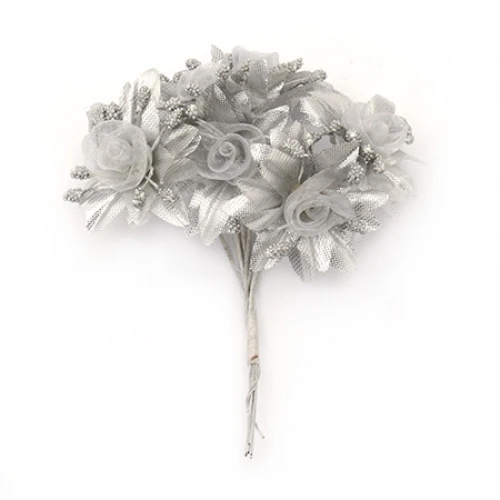 букетче - цвете от текстил и органза с тичинки и дръжка , сребристо